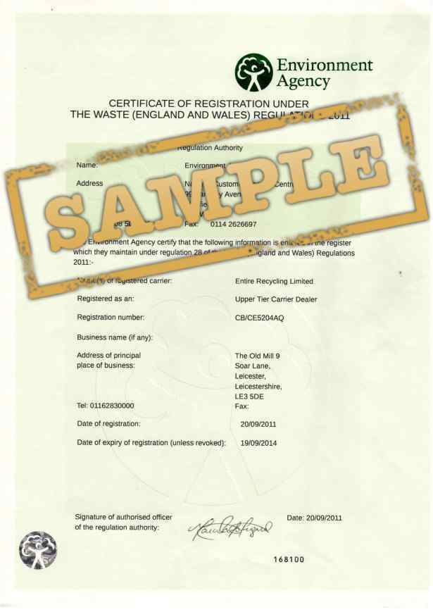Entire Recycling is fully licensed for the carrying of waste. You can see a sample copy of our licence below. A copy is available on request, sample documents are placed on the Internet to prevent the document being used by anyone else.